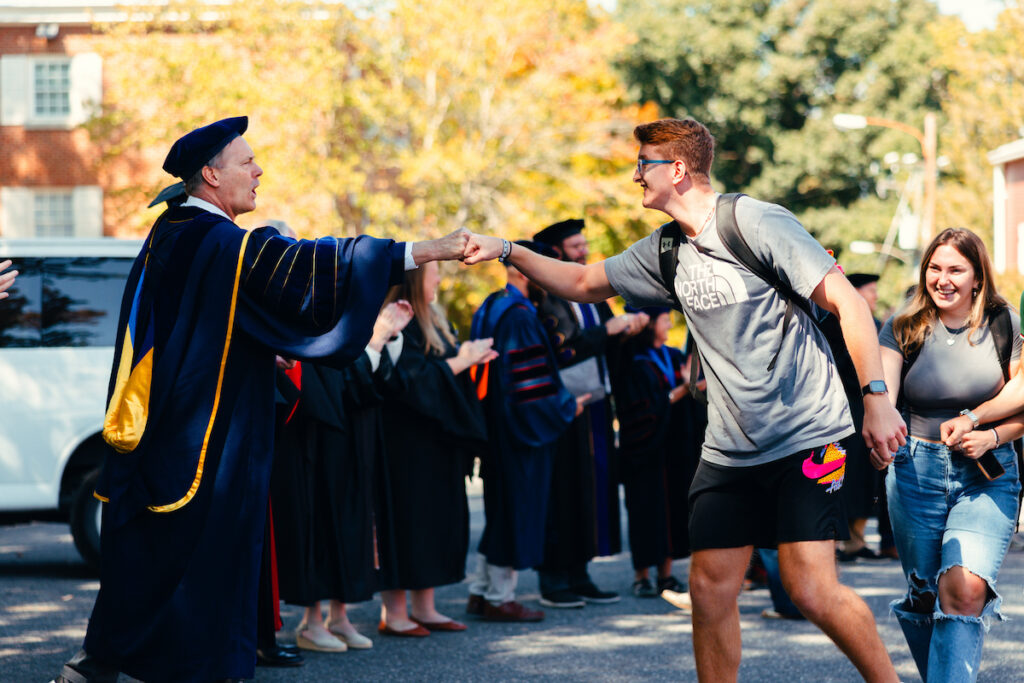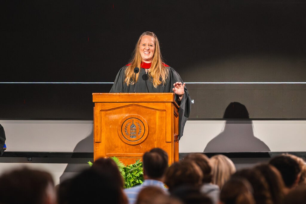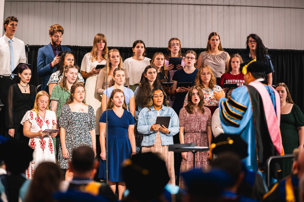 The event featured the traditional processional and recessional of faculty in their regalia. Attendees joined together in singing “Amazing Grace” to open the convocation, and the university choirs and alumni closed the gathering with a performance of “Shenandoah,” directed by Professor Benjamin Gaughran.